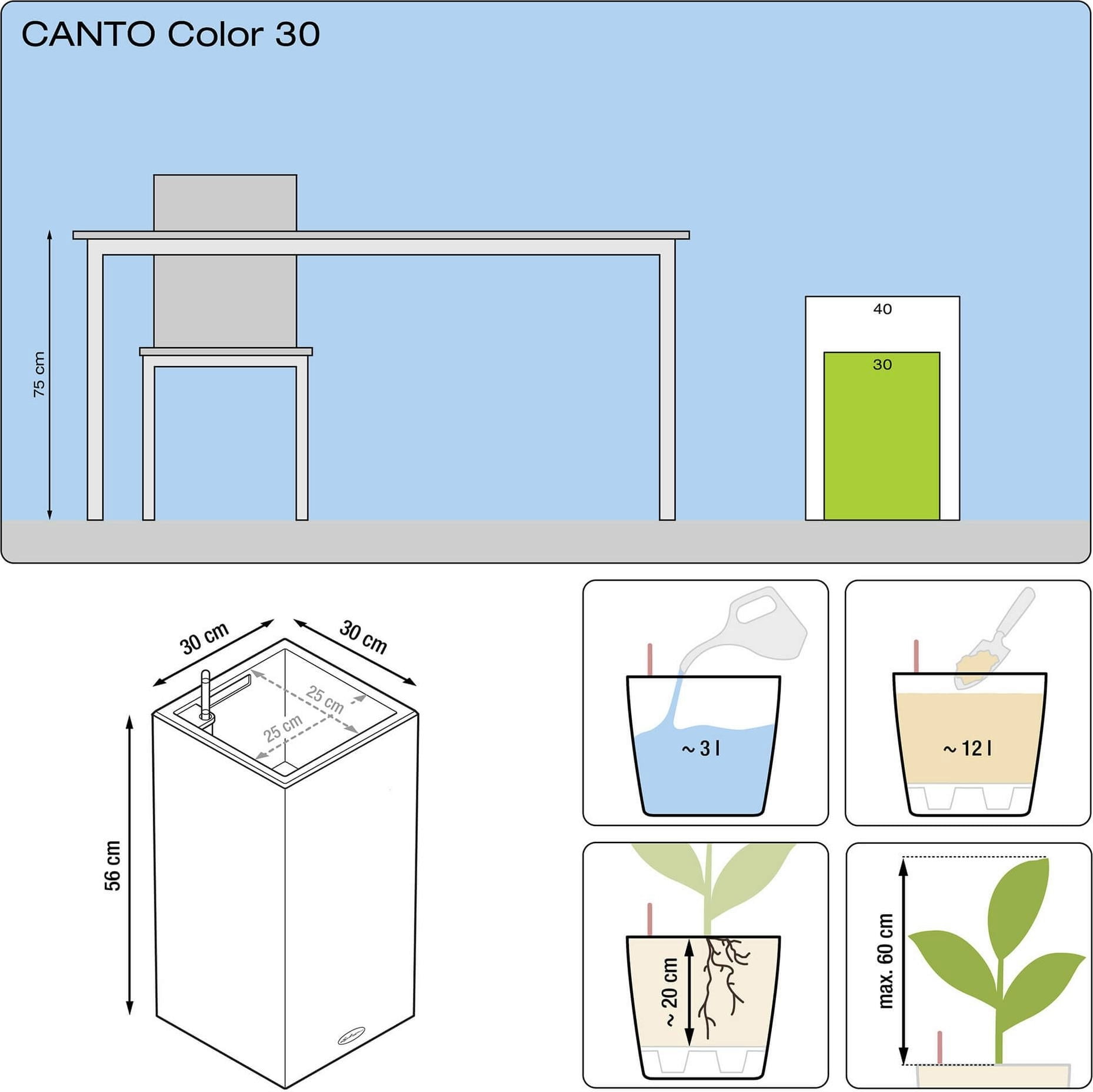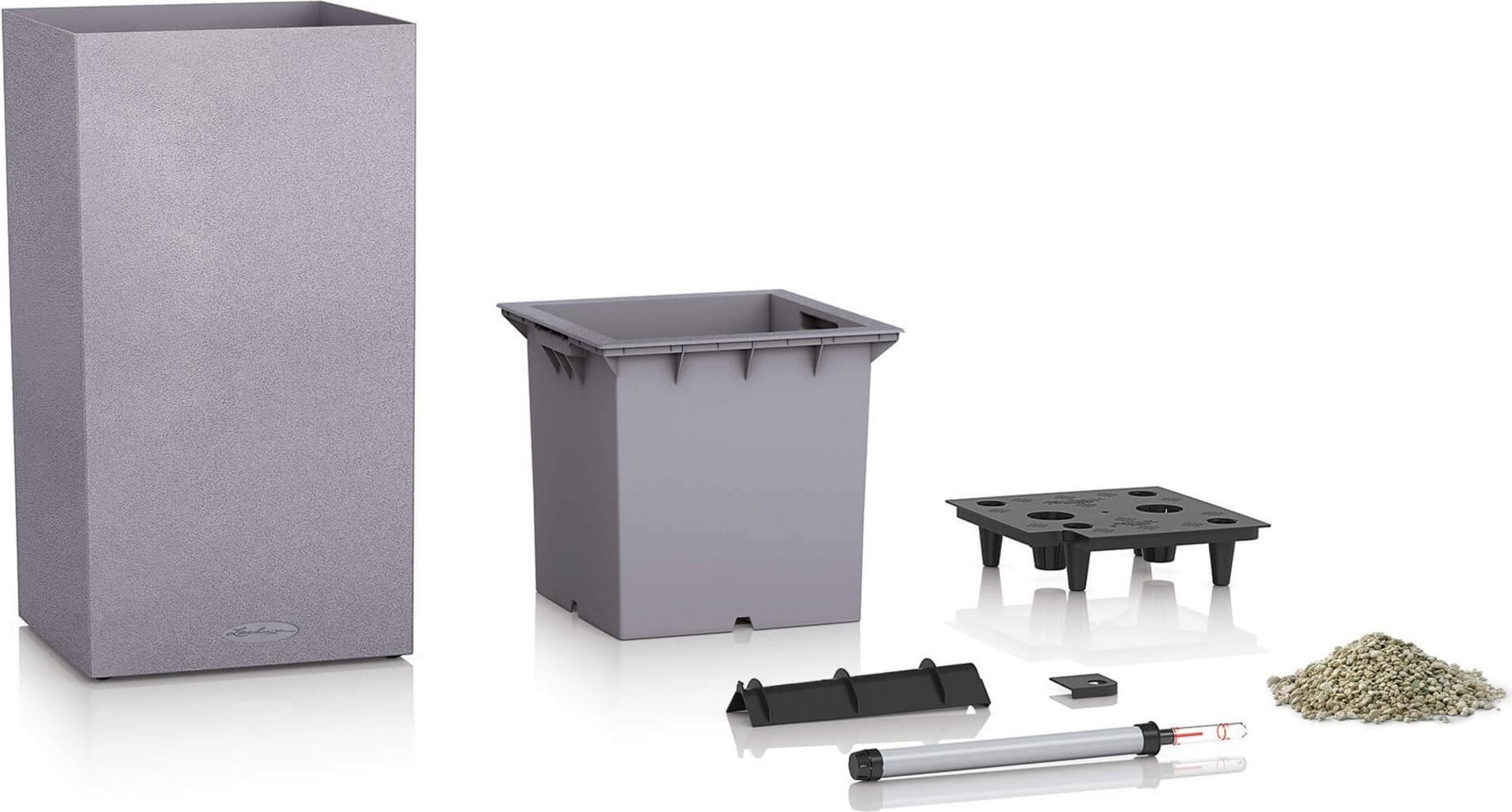 A szett tartalmazza a virágtartót, a betétet és az öntözőszettet. Az azonos méreteknek köszönhetően a CANTO Stone betétek könnyen kicserélhetőek a két modell, a kocka és az oszlop között.