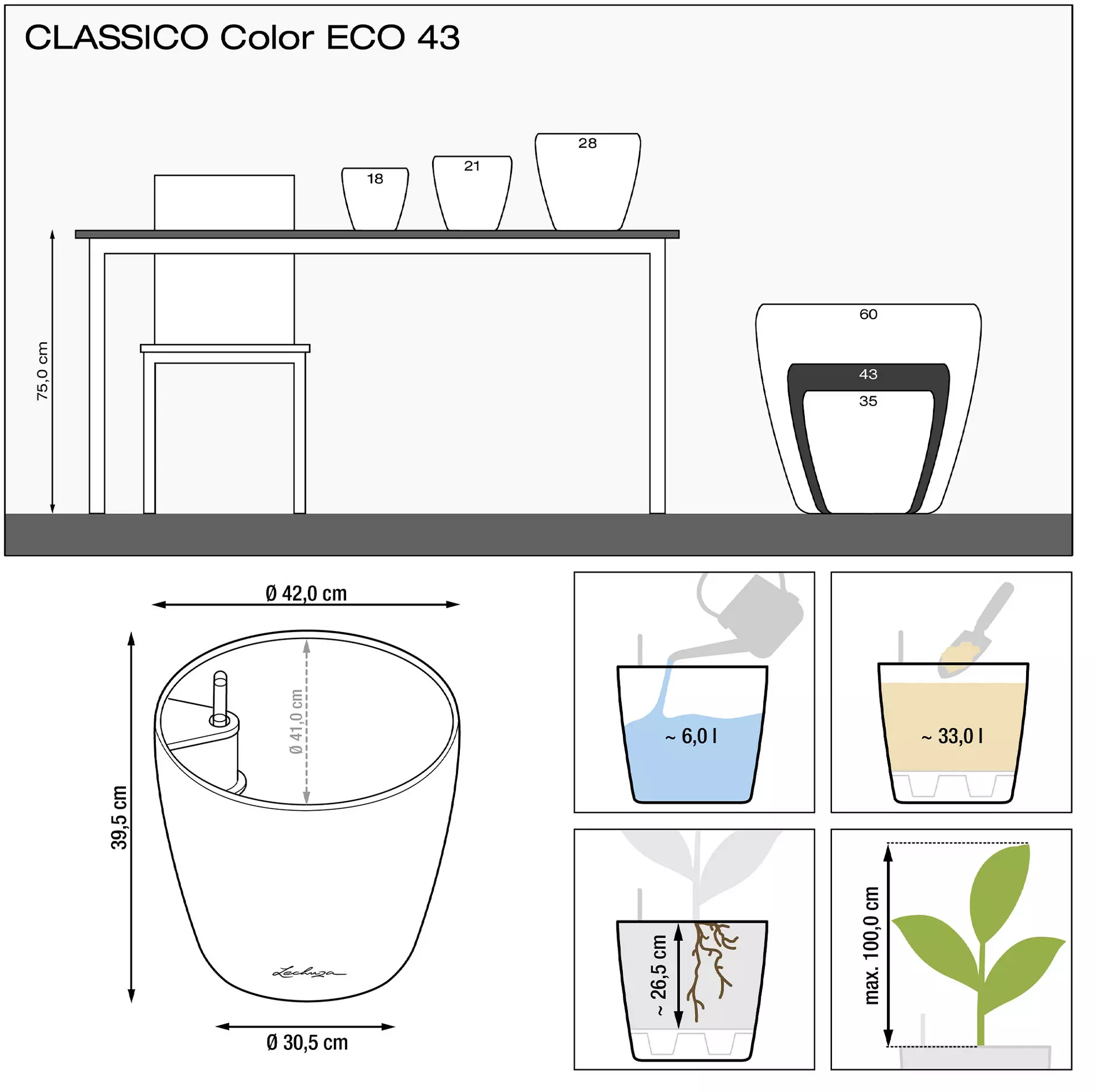 Komplett szett egy virágtartóval (Ø 43 cm), klasszikus öntözőrendszerrel és növényi granulátummal