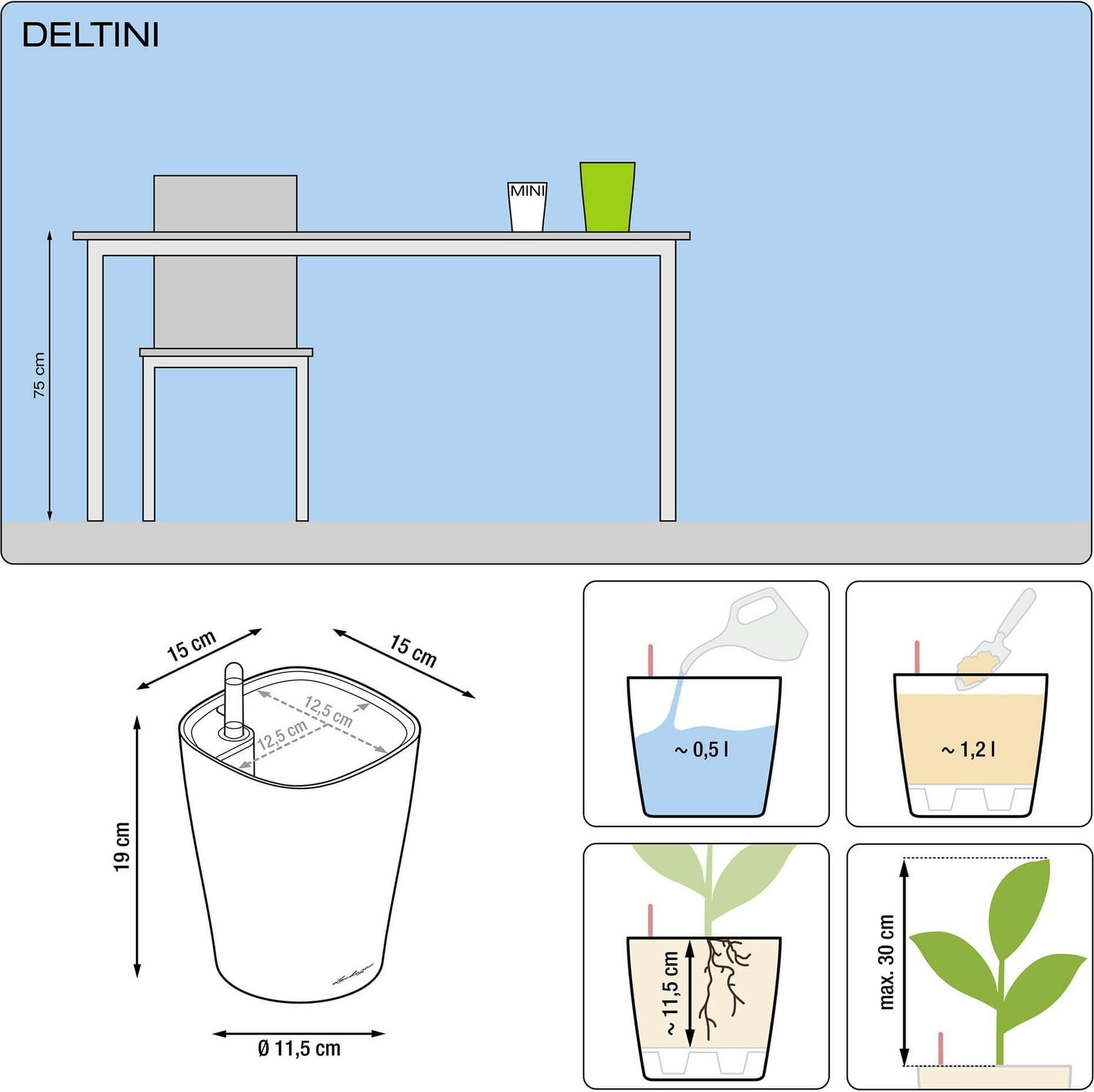 Akár asztaldíszként, akár aájndékként vagy az ablakpárkányra - a Deltini virágtartó mindig szemet gyönyörködtető és mindenkit boldoggá tesz. És ami a legjobb az egészben, a tartók nemcsak jól néznek ki, hanem az öntözőrendszernek köszönhetően csodálatosan frissen is tartják a virágokat!