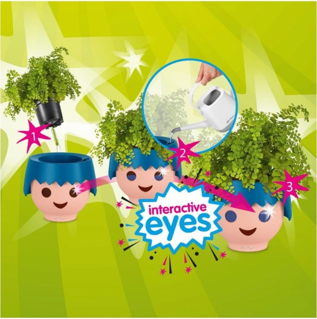 Egy PLAYMOBIL-figura feje, amely a növényekkel egy vicces frizurát kap. A nagy, kerek szemek a PLAYMOBIL tipikus megjelenésében megmutatják, mennyi víz van a tartályban. Ha az Interactive Eyes kékre vált, a víztartály megtelt. Így a gyerekek mindig figyelemmel kísérhetik a növény jóllétét.