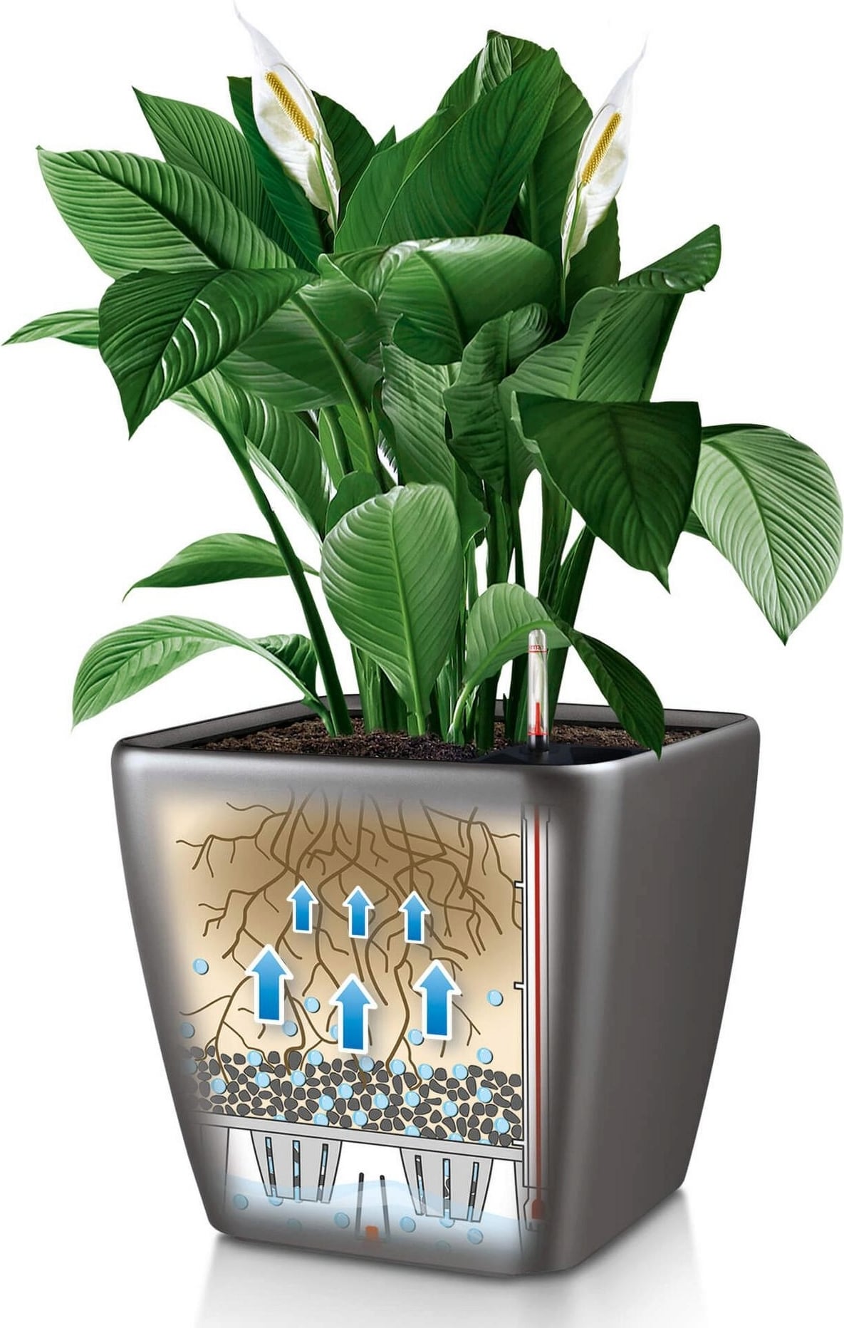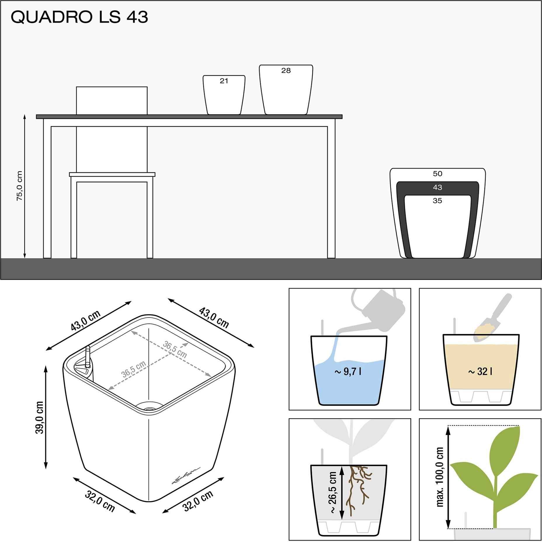 Az intelligens rendszerű Quadro virágtartó egyszerű, modern és elegáns megjelenéssel rendelkezik. A praktikus, szabadalmaztatott betétnek köszönhetően a növényzet könnyen kicserélhető.