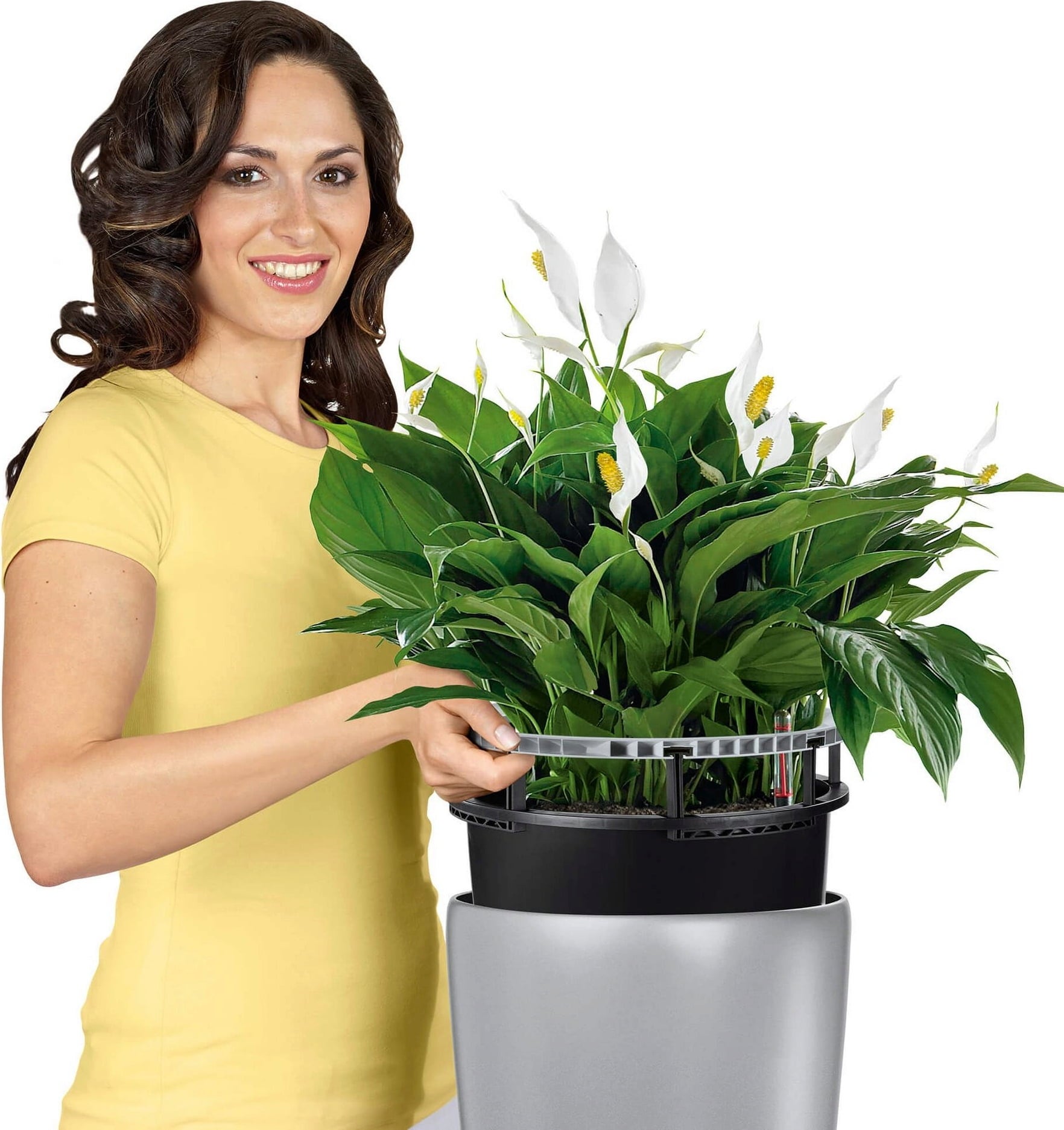 A szabadalmaztatott fogantyúval ellátott betét a virágtartóval megegyező színűre festett, valamint megkönnyíti a növény ápolását.