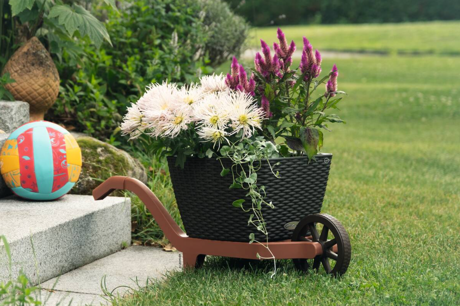 A kiváló minőségű műanyagból készült, robusztus talicska sokféleképpen kombinálható az előkertek és teraszok díszítéséhez.