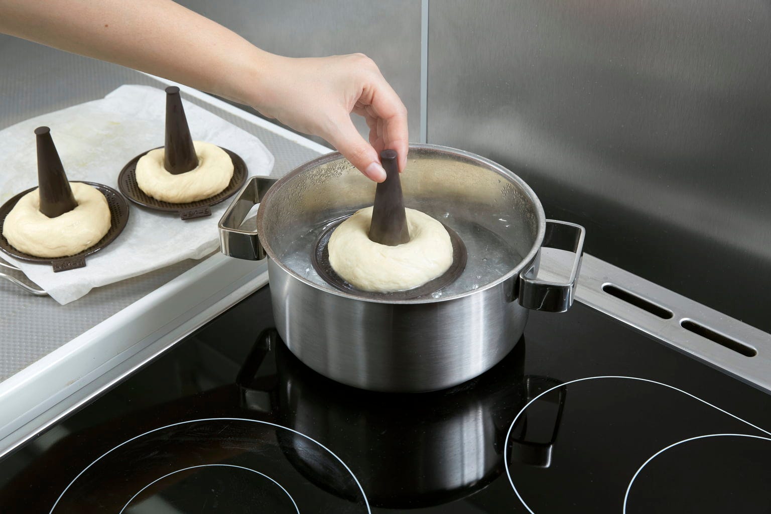Egy másik okos részlet a formák finom mikroperforációja: ezek lehetővé teszik a felesleges víz tökéletes elvezetését a főzés után, így biztosítva a sütés során az egyedülállóan ropogós kérget. A mellékelt eredeti receptekkel azonnal nekiláthat, és felfedezheti az autentikus, házi készítésű bagelek élvezetét!