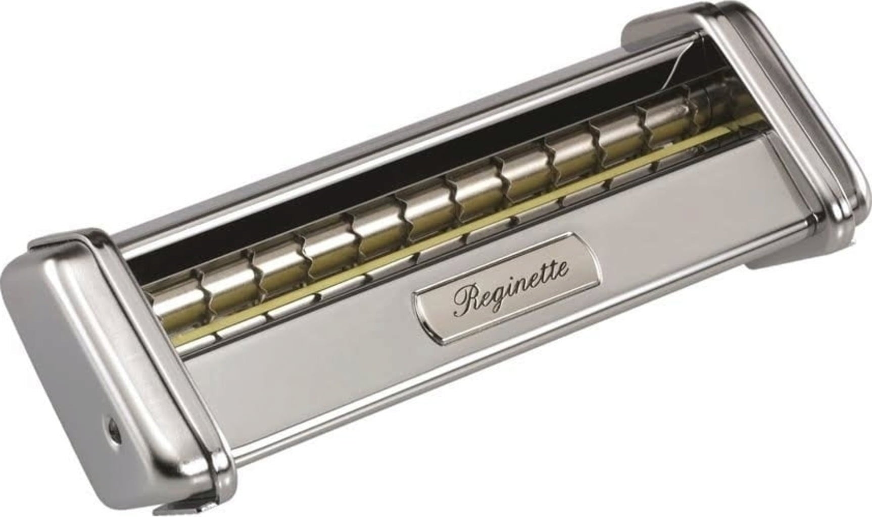 A Reginette tartozékkal a tészta gyönyörű, hosszú, 12 mm széles tésztává dolgozható fel. Ennek a fajtának a különlegessége a gyönyörű hullámos szél, amely egy kevés meseszerűséget kölcsönöz a tésztának. Ezt a nápolyi különlegességet Mafaldine tésztának is hívják, és tökéletesen passzol a fűszeres szószokhoz és a kifinomult ételekhez.