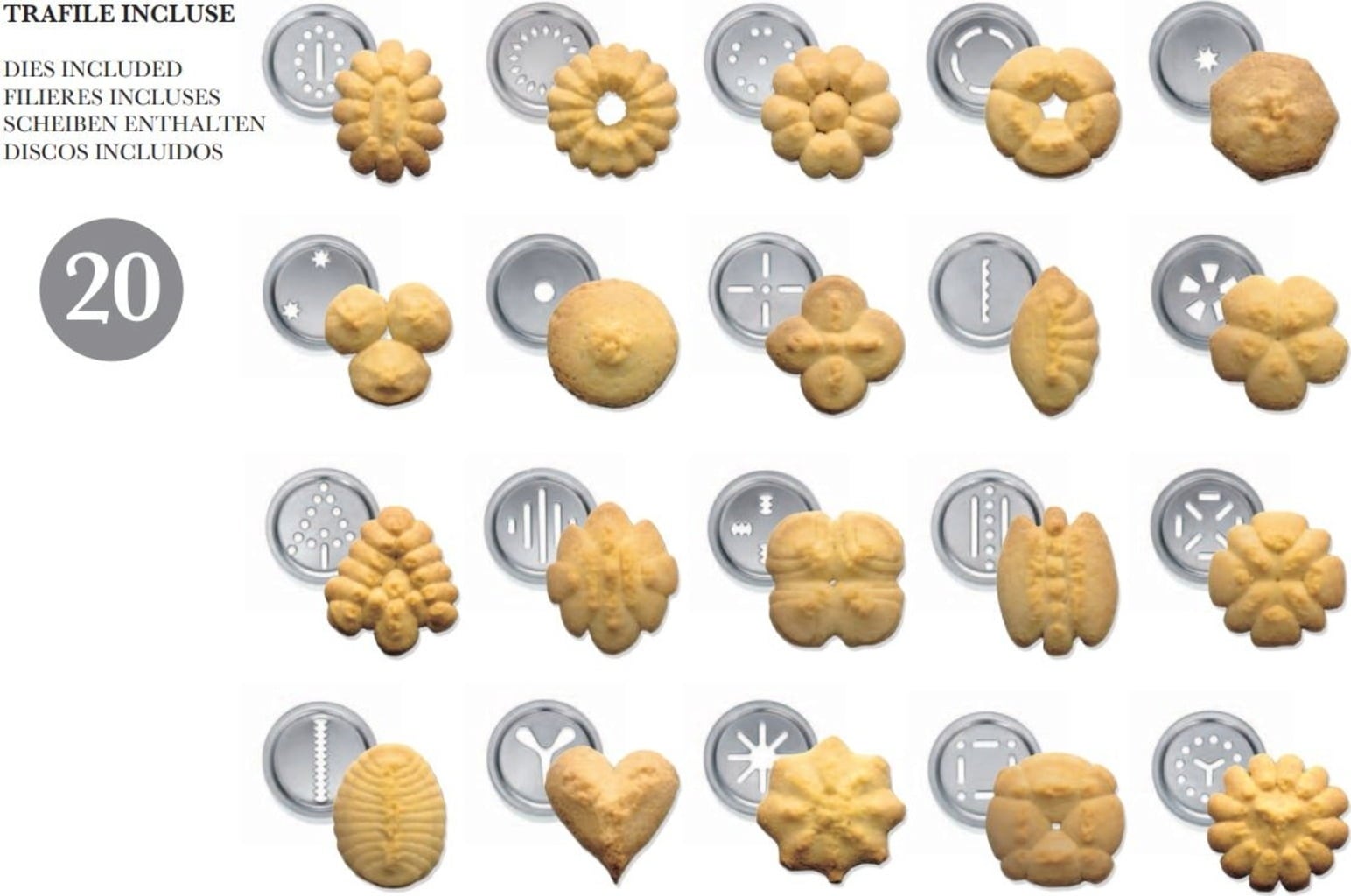 A keksznyomó segítségével 20 különböző formájú sütemény készíthető. Egyszerűen töltse a tésztát a nyomóba, és helyezze rá a kívánt formát. Egy töltéssel kb. 20-25 nagy vagy 35-40 kicsi keksz gyártható. További előnye, hogy nem kell a tepsit kivajazni, sütőpapírral kibélelni.