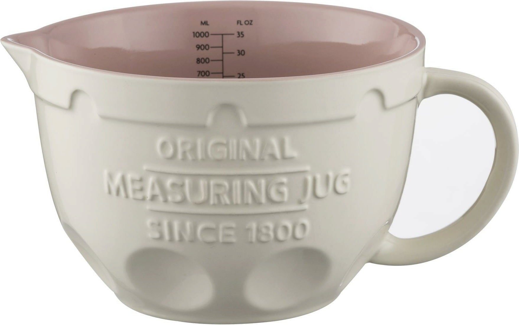 Ez a Mason Cash mérőkancsó nemes vidéki stílusban készült, és kiváló minőségű mázazott agyagból készült. Praktikus belső mérőskálával, kiöntőcsővel és fogantyúval a mérőpohár ideális kiegészítője a konyhai és a sütési kellékeknek. A törésálló mázazott agyagból készült bögre űrtartalma 1 liter. A mázazott agyag törésállóálló, mikrózható és mosogatógépben is biztonságosan tisztítható.