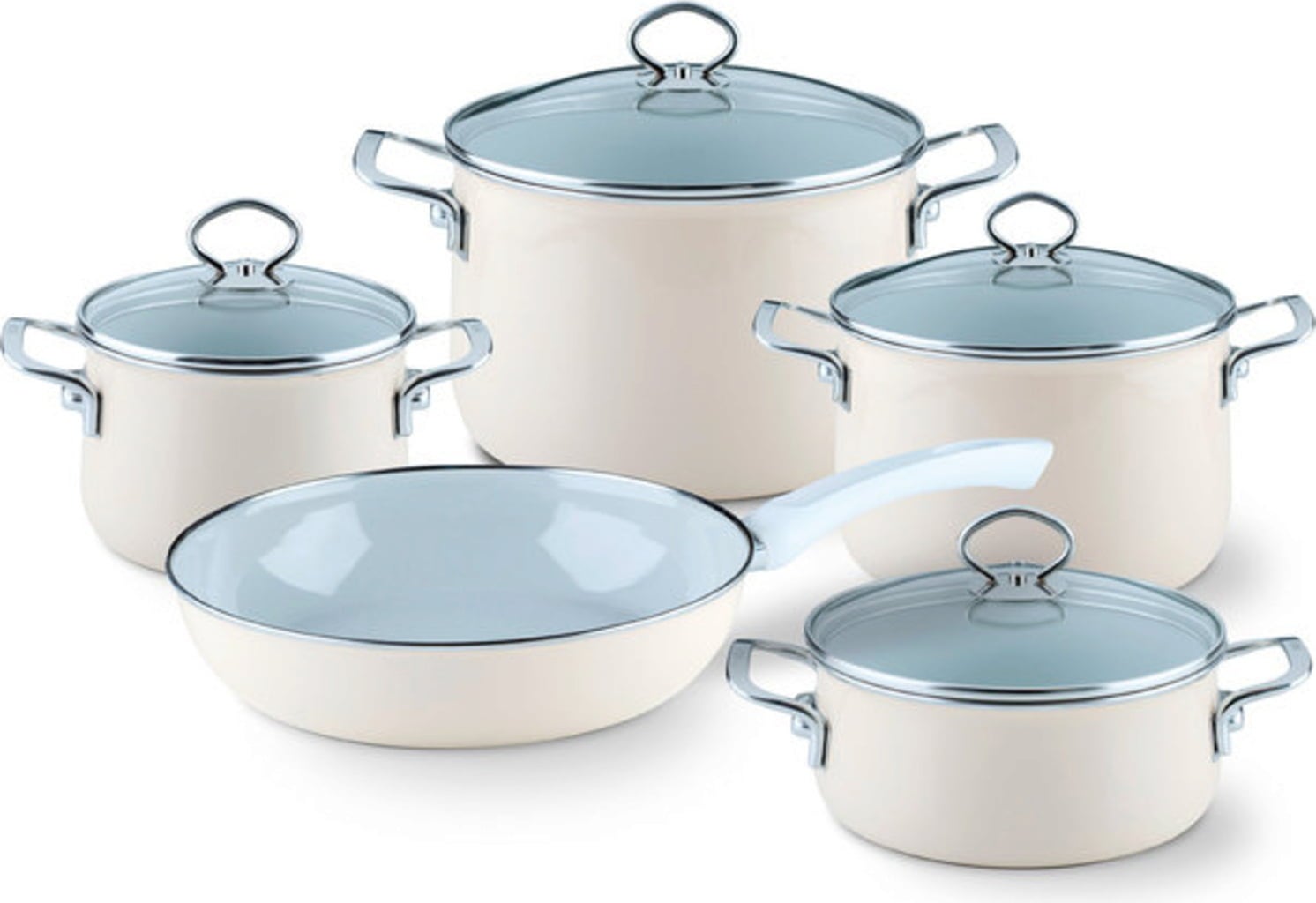 RIESS elefántcsont színű edények kiváló minőségben - mindazoknak, akik értékelik az elegáns színeket, a modern formákat és a magas funkcionalitást. Csúcsminőségben kivitelezve, extra erős acél hőtároló aljjal és üvegtetővel!