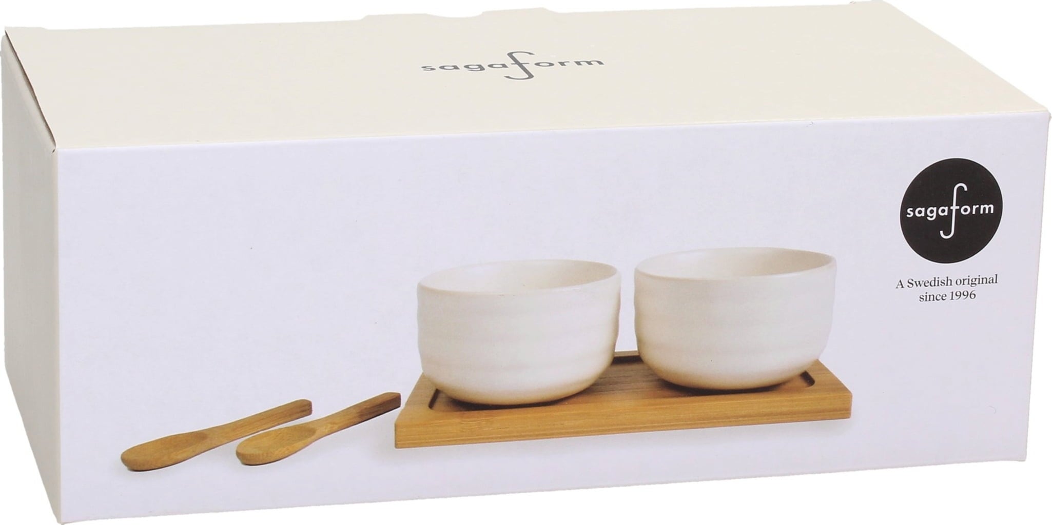 A két csinos tál kőedényből készült és 170 ml-es űrtartalmú, így ideális dióval, diákcsemegével és egyéb finomságokkal való megtöltéshez. A két kis bambuszkanálnak köszönhetően mindenki teljesen higiénikusan szolgálhatja ki magát a rágcsálnivalókból. A praktikus tálca szintén bambuszból készült, és lehetővé teszi, hogy egy kézzel, egyszerűen tálalhasson.