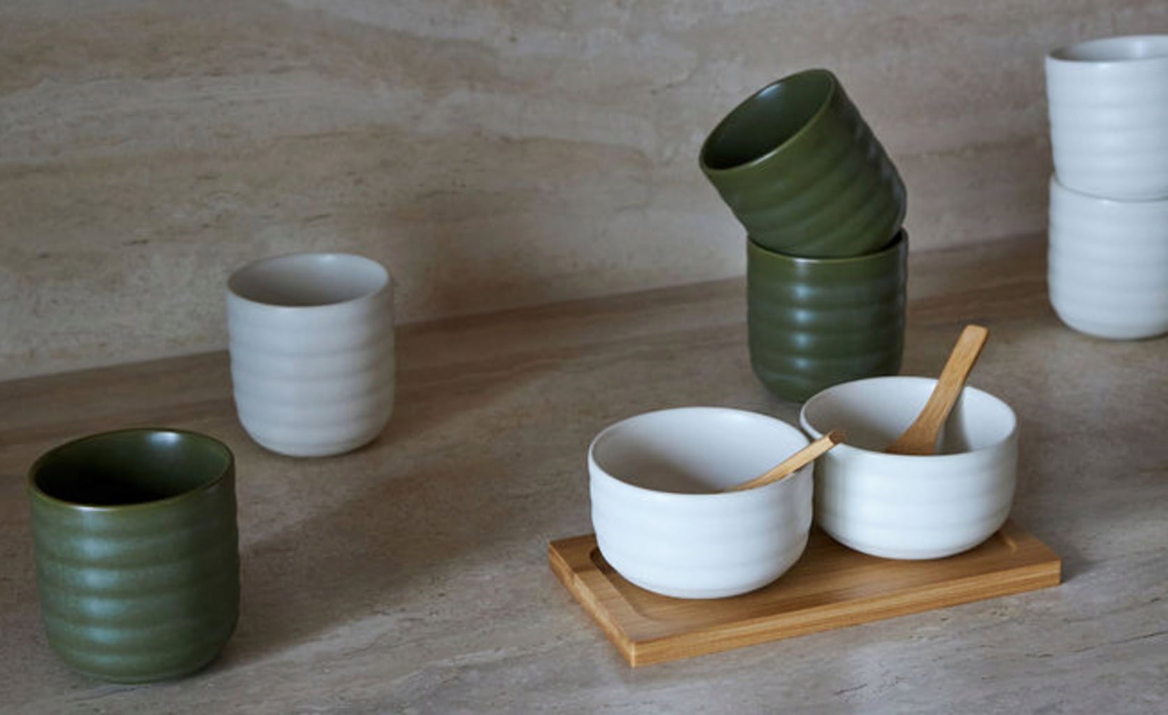 Anyag: kőedény (tálak), bambusz (kanál és tálca)