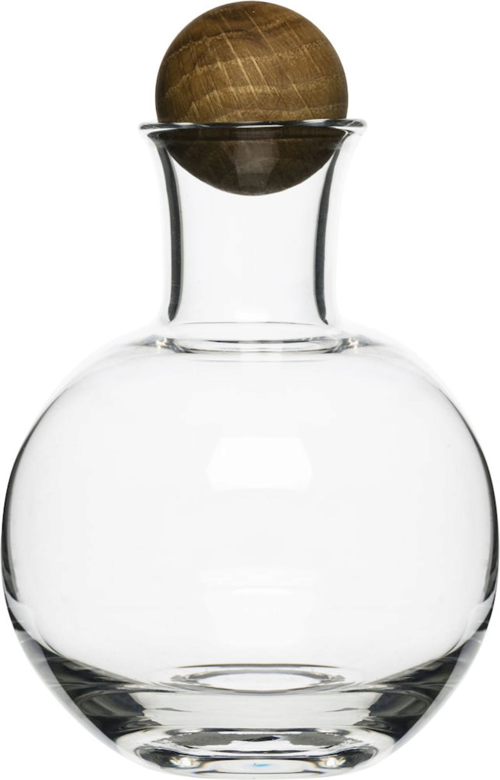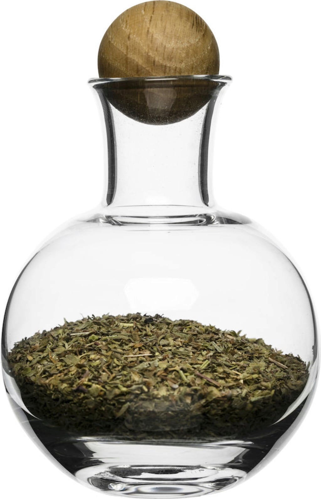 Szájjal fújt üvegből készült, tölgyfa gömb-fedéllel.