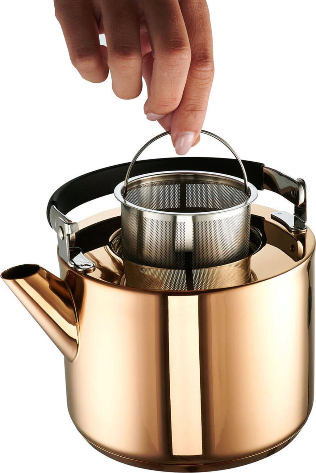 Stílusos és praktikus a Katja - Teáskanna. A nagyszerű réz megjelenésű rozsdamentes acél minden tűzhelytípussal kompatibilis. Ha a víz felforrt, a kedvenc tea a kivehető szűrő segítségével azonnal elkészíthető.
