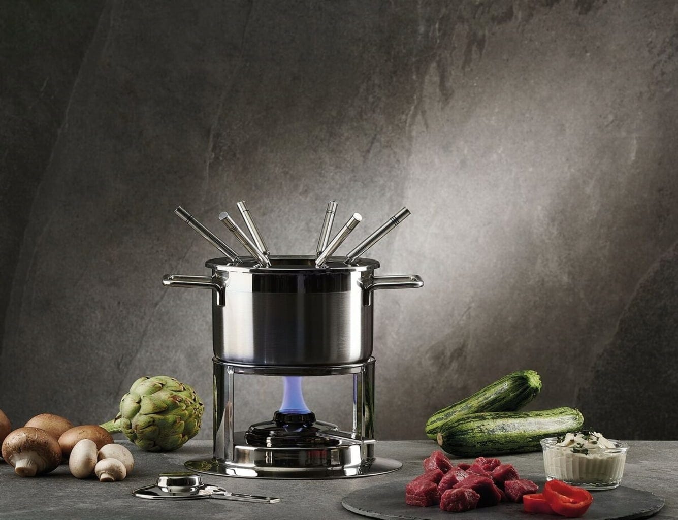 Sajt, zsír, alaplé vagy csokoládé? Mindegy, hogyan preferálja a fondue-t, ezzel a szettel a társasági lakoma bármikor elkezdődhet. A kiváló minőségű rozsdamentes acélból készült edény minden elterjedt tűzhelytípuson melegíthető. Emellett sütőben is használható és mosogatógépben is tisztítható. A hat darab villát egyedileg jelölték meg, hogy senki ne veszítse szem elől a saját finomságait.