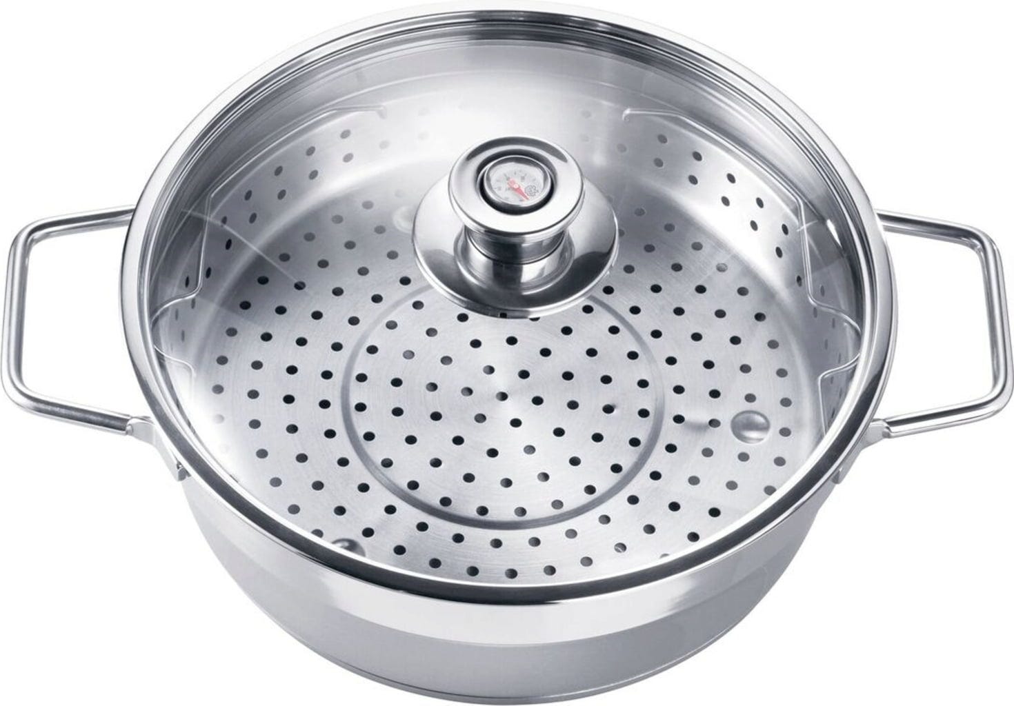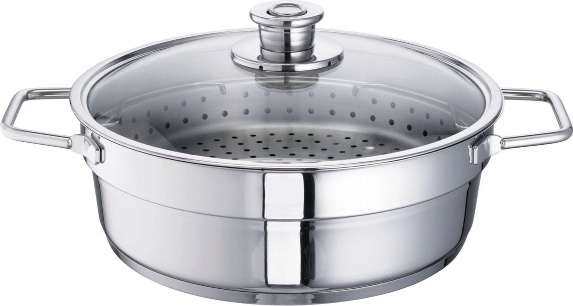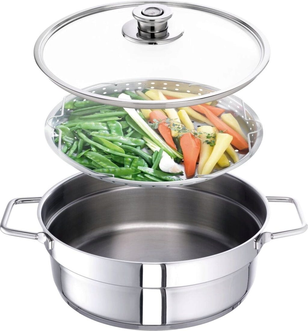Multifunkcionális főzőedény, amely különösen kíméletes és aromás elkészítést tesz lehetővé. Ehhez először öntsön vizet a kiválasztott aroma-összetevőkkel együtt az edénybe. Amikor a víz forr, helyezze a friss élelmiszereket a párolóbetétre. Így minden fontos vitamin és tápanyag megmarad.