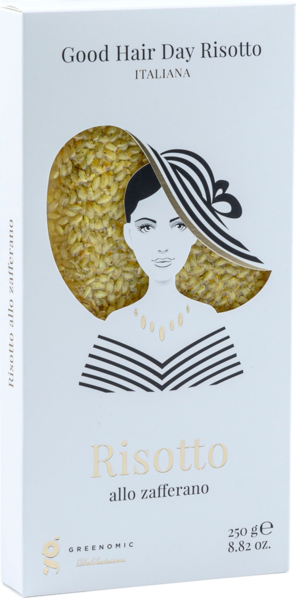 A Greenomic Good Hair Day rizottó egy csodálatos ajándékkosár lehet mindenkinek, aki szereti az eredeti dizájnt! A Risotto allo zafferano-t sáfránnyal finomították, illetve kurkumával enyhén megszínezték. Így minden rizottós ételnek egy kevés színt és finoman aromás extra jegyeket biztosít.
