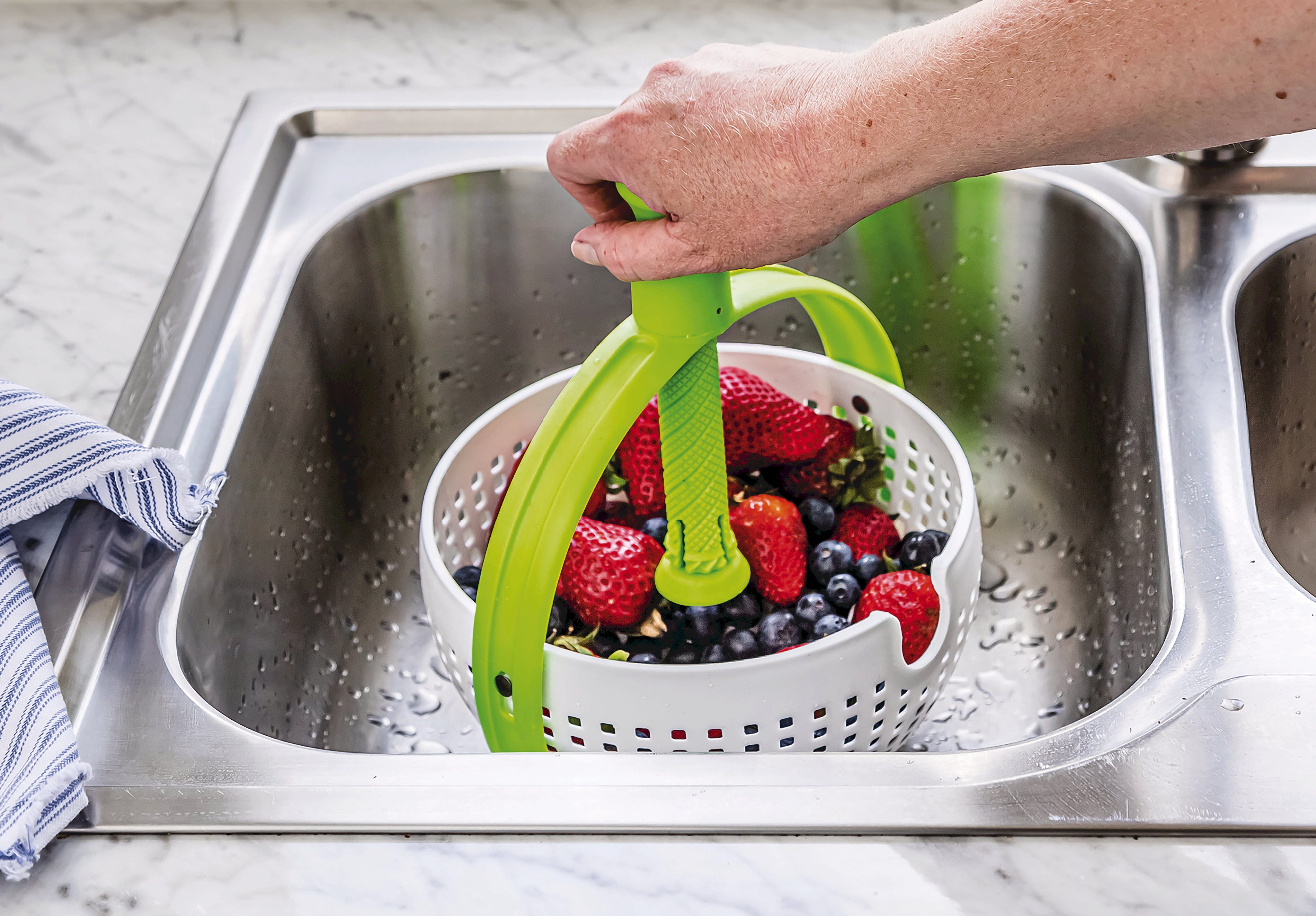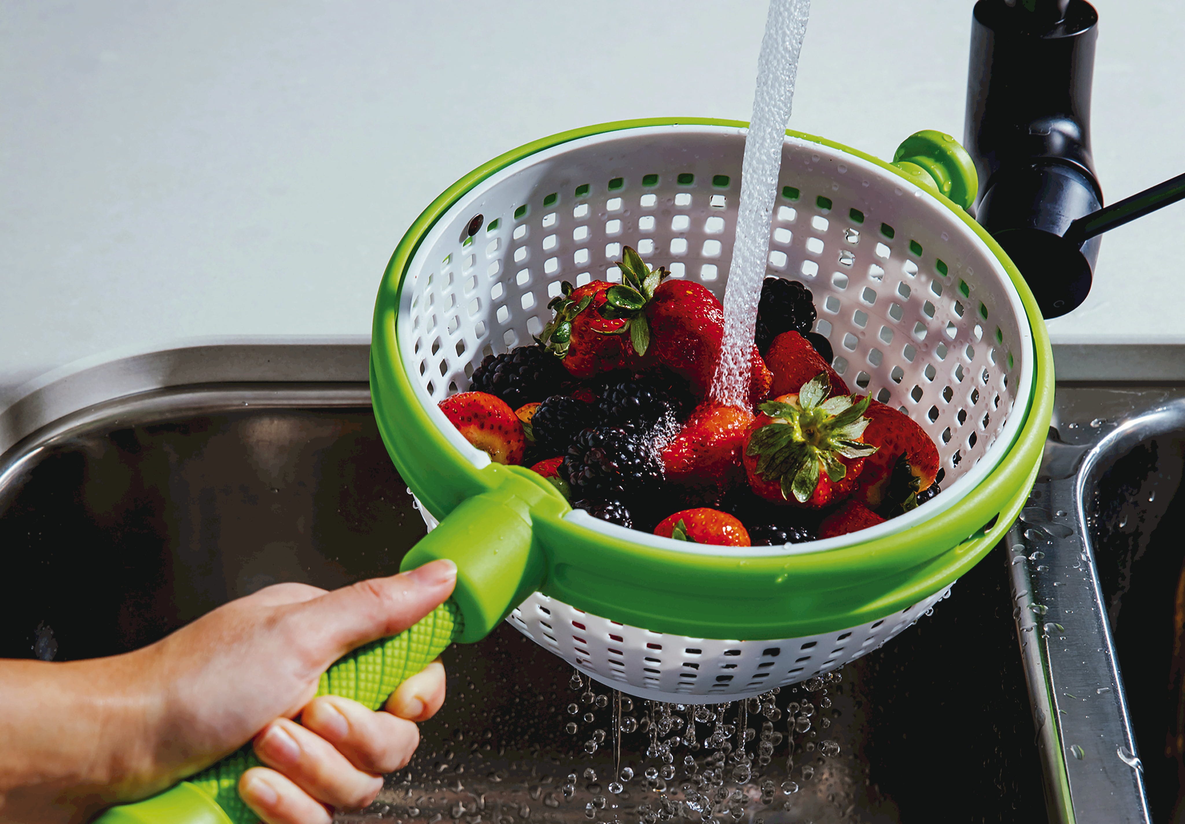 A Dreamfarm Spina salátacentrifugával egy zseniális 2 az 1-ben csodát szerezhet be konyhájába, amely tökéletesen ötvözi a szűrőt és a centrifugát. A csúszásmentes talpnak köszönhetően a salátát, zöldségeket vagy bogyós gyümölcsöket közvetlenül a mosogatóban, csúcssebességgel pörgetheti szárazra, miközben a túlnyúló oldalak gondoskodnak arról, hogy a tartalom garantáltan a tálban maradjon.