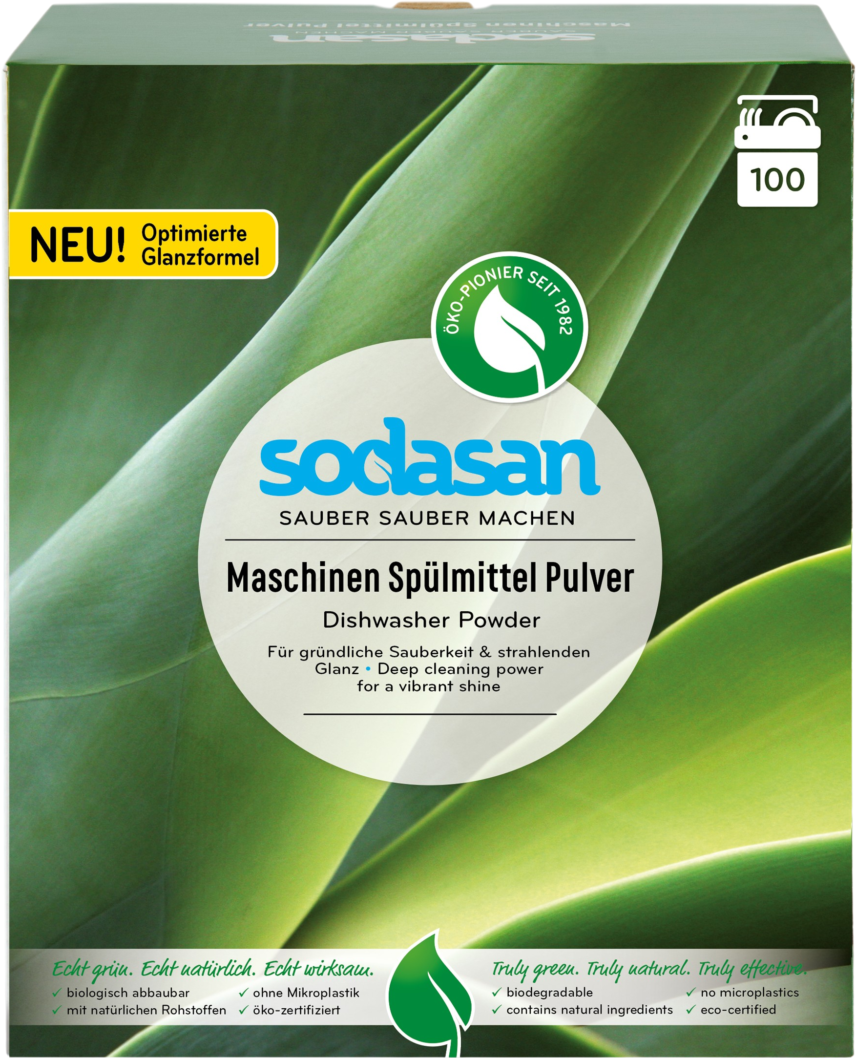 A SODASAN gépi mosogatószer por kizárólag növényi alapú mosószereket tartalmaz. A nátrium-citrát vízlágyítóként szolgál, és egyidejűleg helyettesíti a foszfátokat.