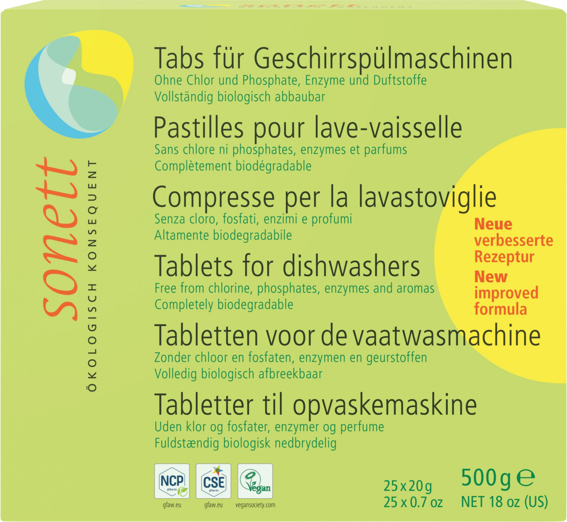 Ezek az ökológiai tabletták minden háztartási mosogatógéphez alkalmasak. Ásványi anyagokat és teljesen lebomló organikus összetevőket tartalmaznak, valamint nagy zsír- és szennyeződésoldó képességgel rendelkeznek, teljesen enzimek, foszfátok vagy klórtartalmú fehérítőszerek nélkül!