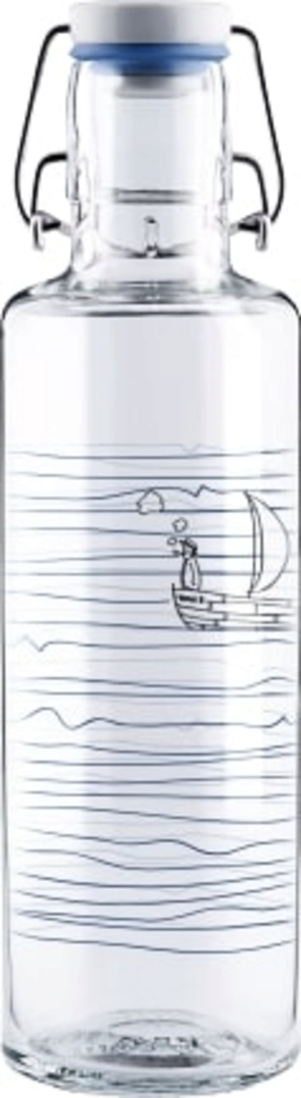 Ez az ivóvizes palack rozsdamentes acélból, üvegből, porcelánból és natúr kaucsukból készül. A nyomat minden tengeri medve szívét elvarázsolja.