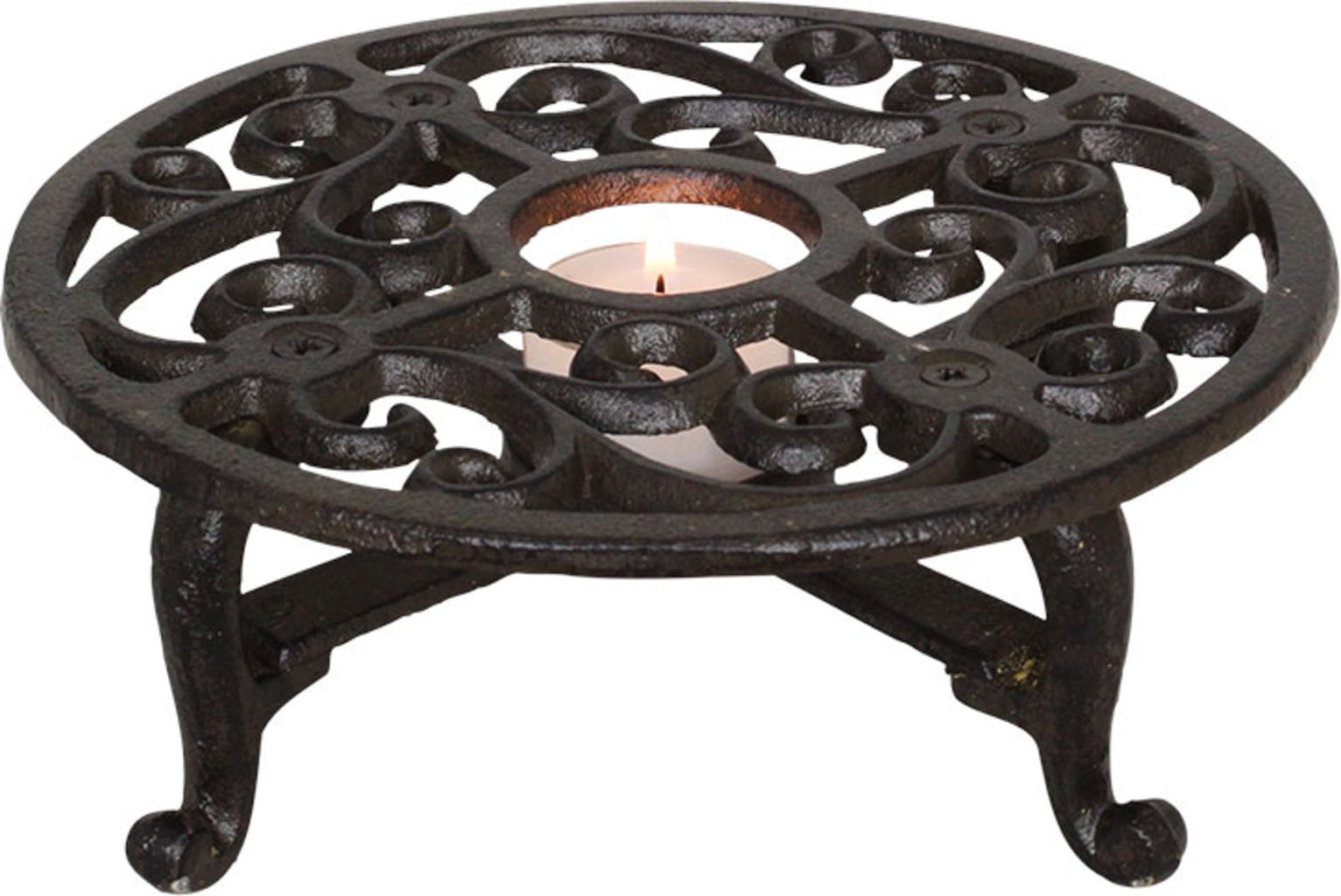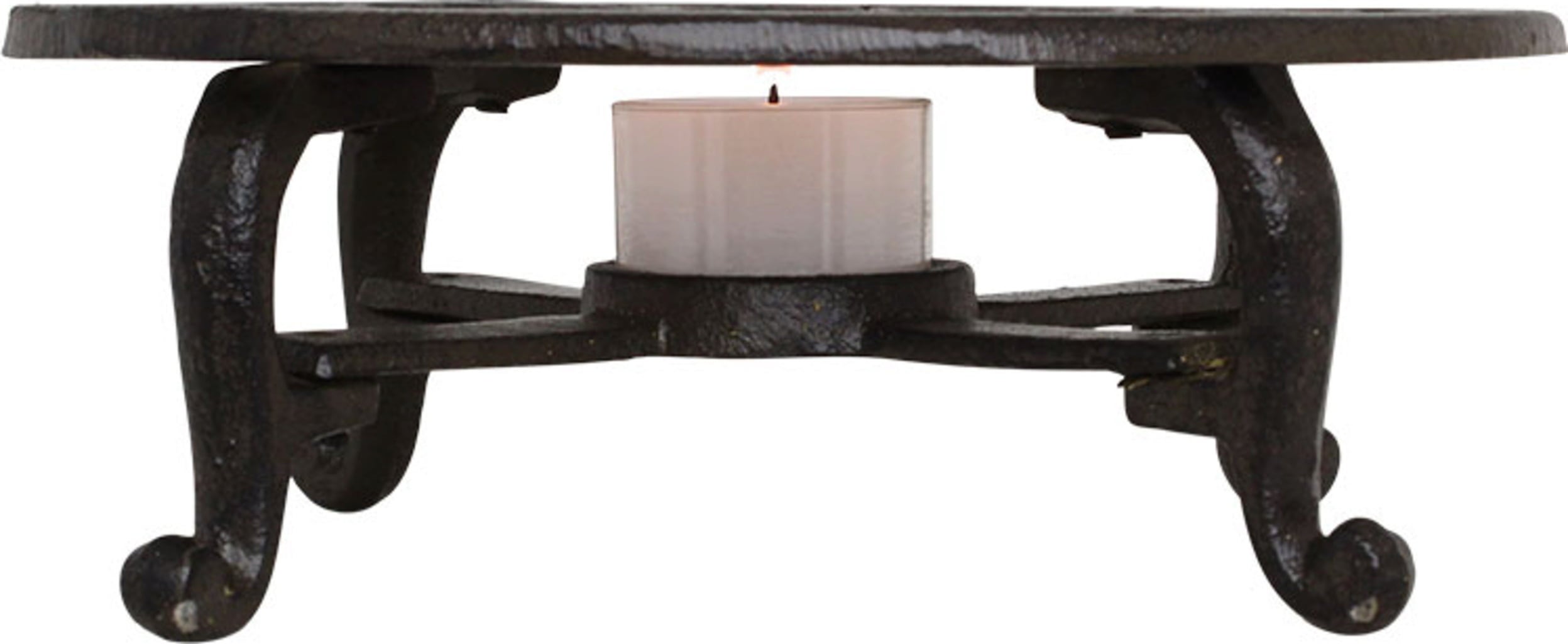 A masszív öntöttvasból készült, rusztikus alátét célja, hogy az italokat és az ételeket hosszú ideig melegen tartsa. Középen van egy mélyedés, amely helyet biztosít egy teamécsesnek. Hőálló edények, például fazekak vagy teáskannák is dekoratívan bemutathatók ezzel az alátéttel.
