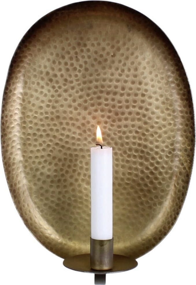 Ez a gyönyörű gyertyatartó falra szerelhető, otthona különleges színfoltja lesz. A kalapált fémből készült hátlap különösen szépen tükrözi vissza a gyertya fényét, ami mesés hangulatot is teremt. Az antik sárgaréz felület különösen szép, ami elegáns, de mégsem tolakodó.