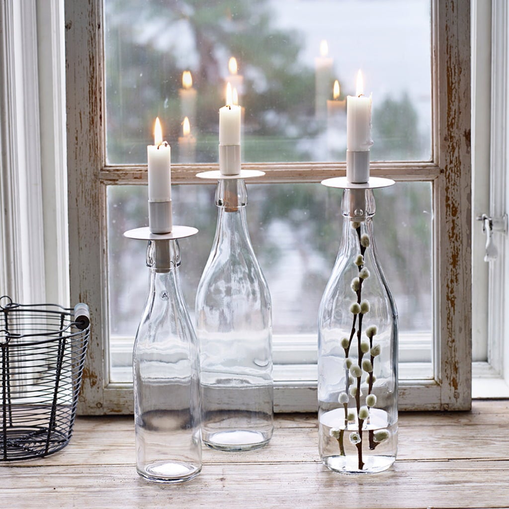 Egy gyertyatartó, amelynek tartója egyedi elképzelések szerint alakítható ki - attól függően, hogy milyen üveget szeretné használni, illetve üres vagy dekorációval töltött üvegeket alkalmazna.