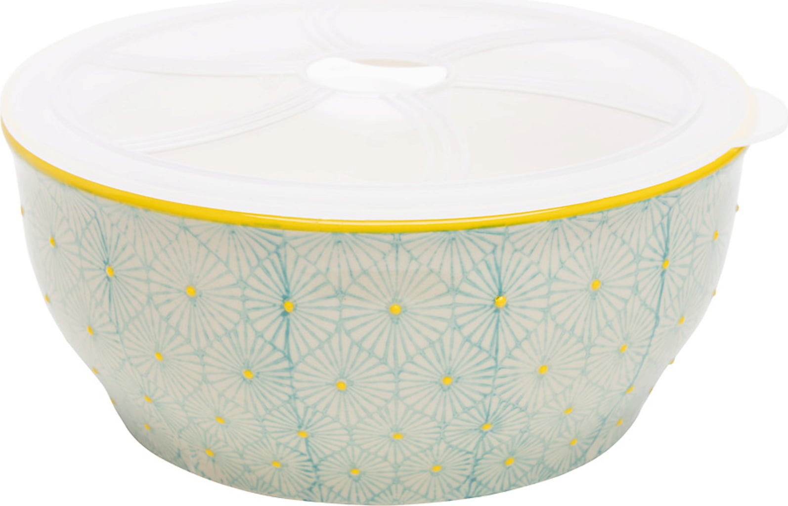 A színes, kézzel díszített minták igazán szemet gyönyörködtetővé teszik ezt a nagyméretű tárolótálat. Kőagyagból készült és szilikon fedéllel rendelkezik. Ez lehetővé teszi az ételek stílusos szervírozását, tárolását vagy akár magunkkal is vihetjük.