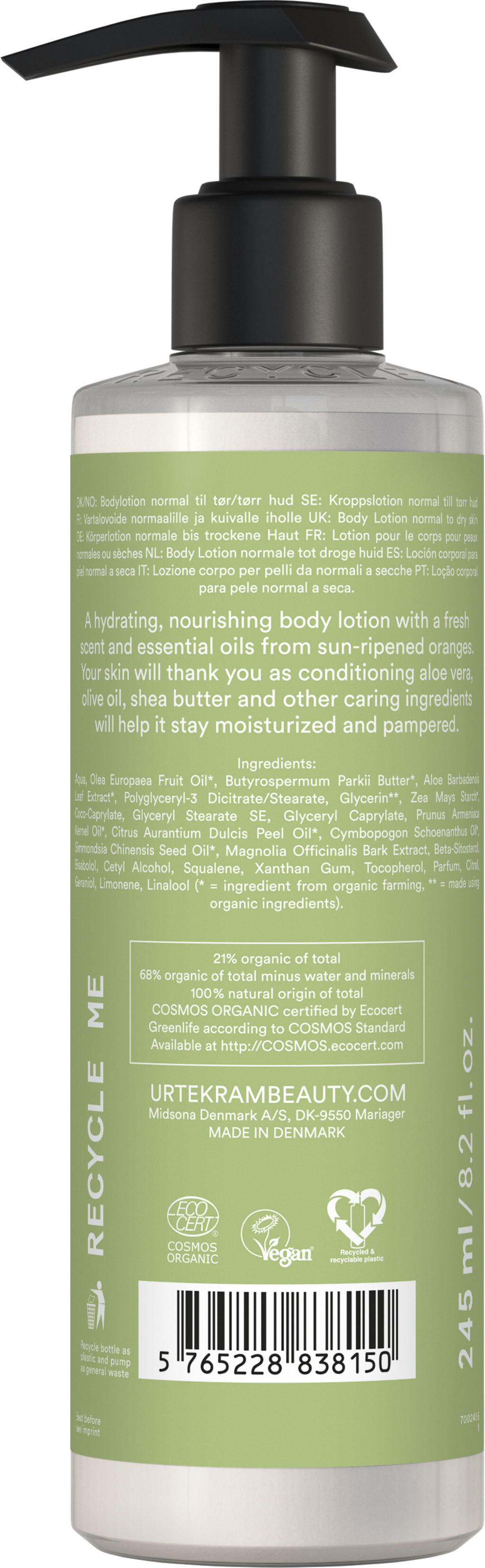 A napérlelte narancs frissességet kölcsönöz a testápolónak, míg az extra magas aloe vera tartalom, valamint a jojoba, olíva és sárgabarackmag bio olajai revitalizálják és táplálják a bőrt.