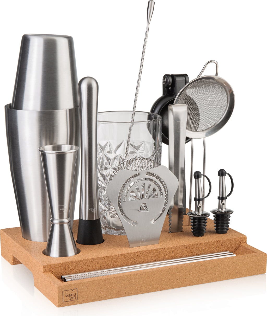Mixeljen profi módon! A Vacu Vin Bar in a Box Master egy 16 részes koktélkészítő szett mindazoknak, akik többet szeretnének kihozni az italaikból. Legyen szó kezdőről vagy tapasztalt hobbi-bártenderről – itt minden megtalálható, ami a tökéletesen kikevert koktélokhoz szükséges. Mindezt stílusosan, egy elegáns parafa talpon prezentálva.