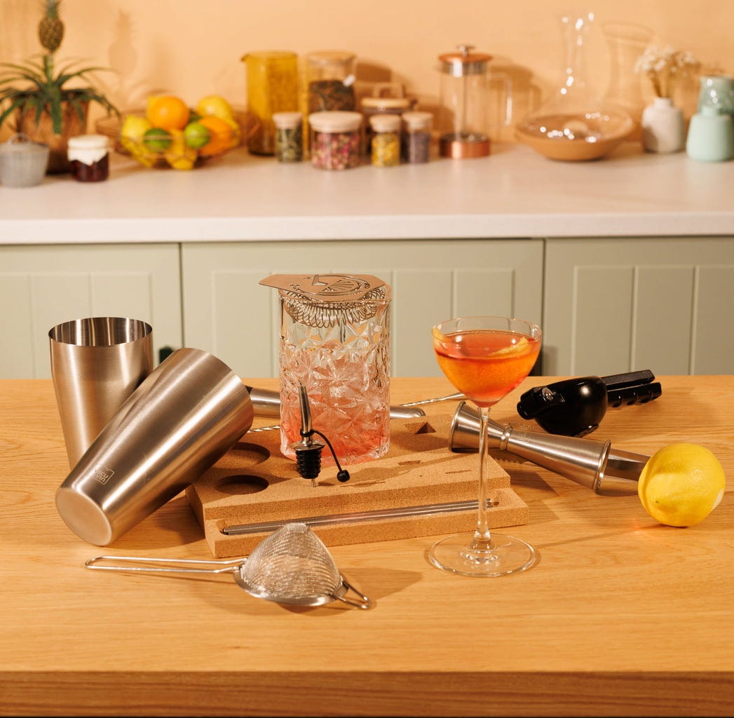 - 16 részes koktél szett olyan kiegészítőkkel, mint a Boston shaker, jigger, muddler, szűrők, szívószálak, fóliavágó és még sok más.