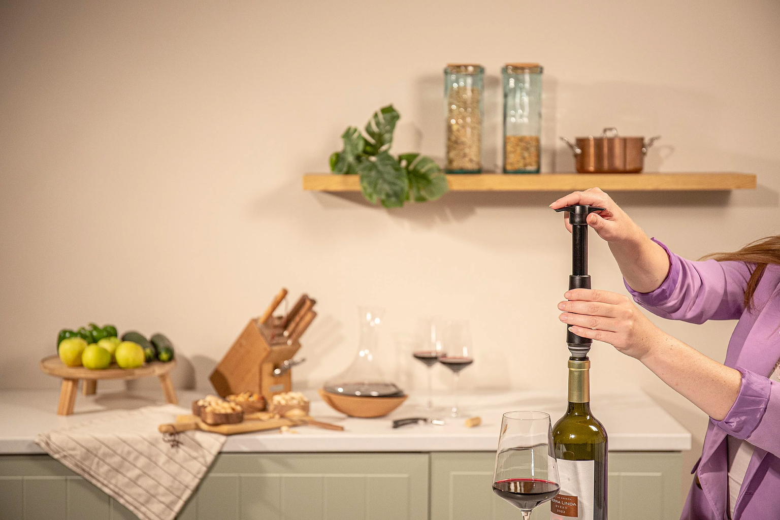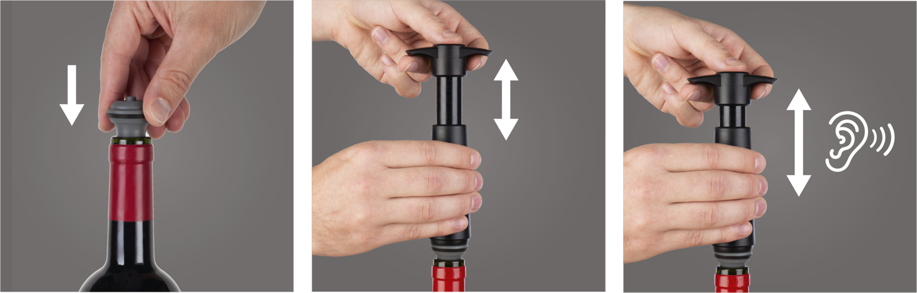 Alkalmazás: Egyszerűen helyezze be a dugót, a pumpával szívja ki a levegőt, amíg egy kattanás nem jelzi az optimális vákuumot – és kész. A bor hosszabb ideig friss marad, akár a hűtőben, akár a pulton tárolja.