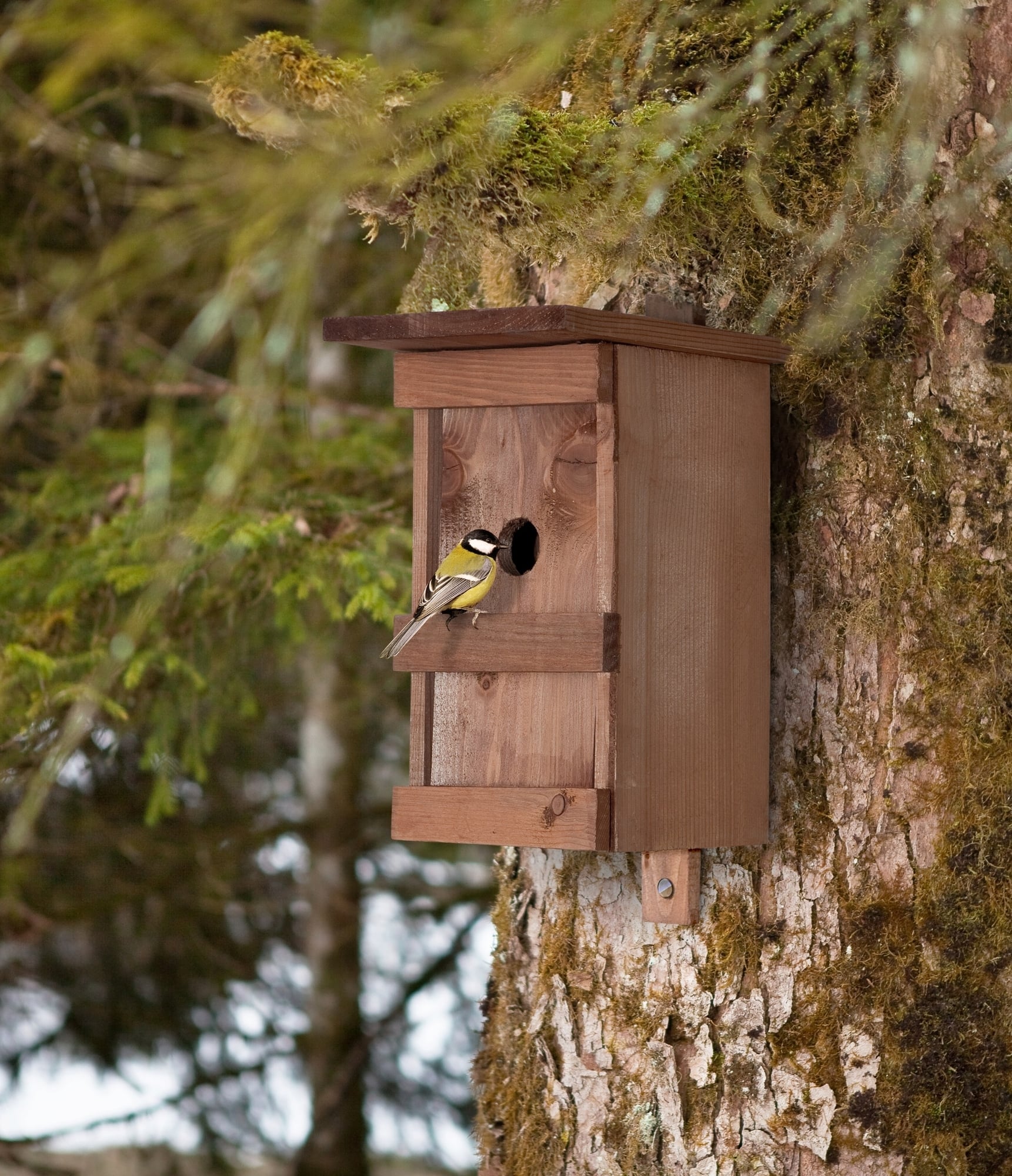Ez a csodás házikó hatékonyan védi az olyan madárfajokat, mint például a tarajos- és kékcinege, a vihartól és a ragadozóktól. Ideális helyet kínál a fiókák zavartalan felnevelésére.